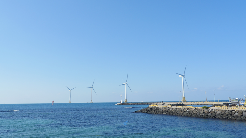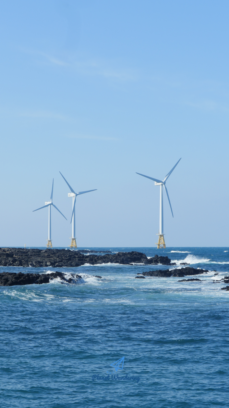 제주 한경면 두모리와 금등리 공유수면에 자리한 탐라해상풍력발전은 2015년 4월에 착공하여 2017년 9월에 완공한 우리나라 최초의 해상풍력발전단지입니다. 3메가와트급 국산 풍력발전기 10기가 설치되었고 해안가에서 가까운 바다에 건설되었기 때문에 해변도로에서도 탐라해상풍력발전의 윈드터빈들을 쉽게 만날 수 있습니다. (ⓒWindKorea)