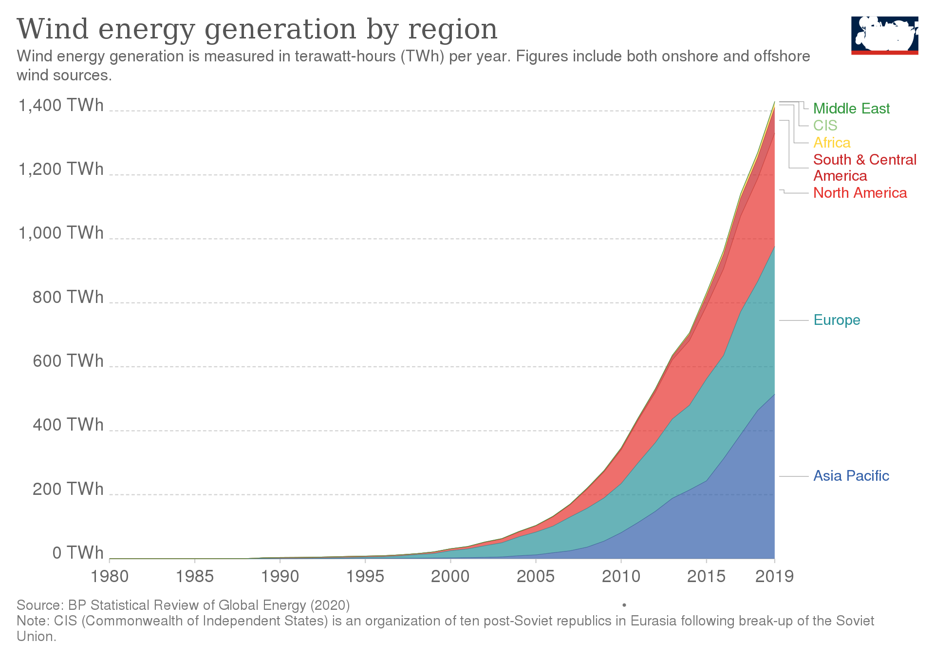 전 세계적으로는 1980년대 중반부터 풍력발전이 모습을 드러내기 시작했고 2019년을 기준으로 아시아와 유럽에서 크게 확산되고 있습니다. (ⓒ WindKorea)